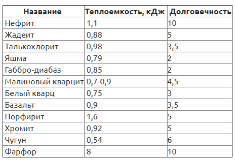 Во время банных процедур камни сначала сильно нагревают, а затем льют на них воду, чтобы получить пар. Далеко не каждая горная порода может выдержать такие резкие температурные перепады. Например, достаточно высоким показатель термостойкости считается у нефрита, чугуна, хромита и некоторых других камней, а менее высоким, но все же допустимым — у яшмы, кварца и т.д.