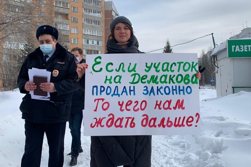 - 16.03.2021 года в 18.00 было установлено, что Пинус Наталья Ивановна, являясь участником публичного мероприятия в форме пикета, с целью «Против продажи земельного участка в Советском районе города Новосибирска у дома №1 по улице Демакова», проводимого на тротуаре по улице Демакова, в период времени с 12.06 до 12.15 7 марта 2021 года не выполнила законное требование сотрудников органов внутренних дел прекратить участие в несанкционированном публичном мероприятии, - говорится в выписанном Наталье Пинус протоколе. – Использовала плакат с надписью «Если участок на Демакова продан законно, что нам ждать дальше?», чем нарушила порядок проведения данного публичного мероприятия, совершила административное правонарушение, предусмотренное частью 5 статьи 20.2 КоАП РФ.