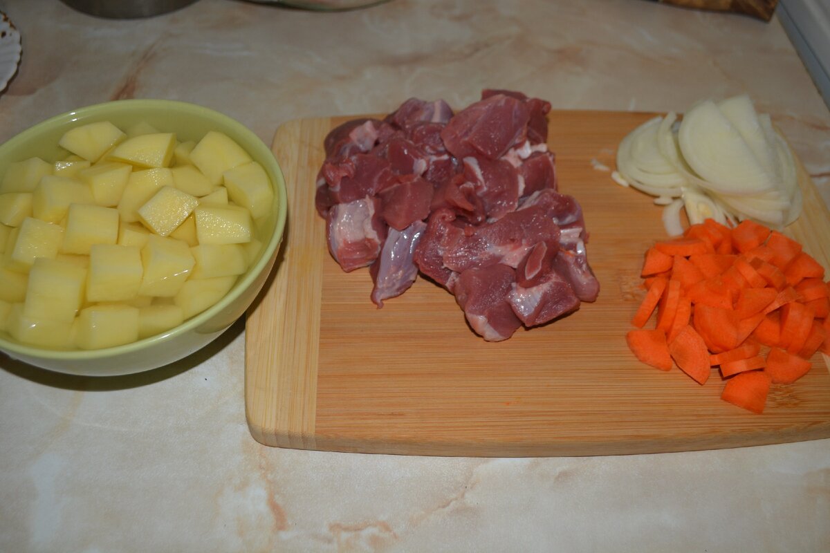 Мяса и картошки примерно поровну. Мясо порезал чуть крупнее картофеля, так как оно немного усядет.