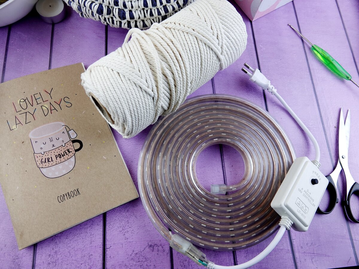 С али экспресс муж заказал светодиодную ленту длиной 4 метра. Бюджетную, не самую дорогую. Веревка хлопковая у меня была, можно найти в хозтоварах такую.