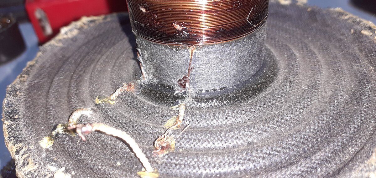 Осмотр и "ощупывание" подвижности диффузора сразу же вызвали подозрения на не мой косяк. При выгорании катушки в 9 из 10 случаев, катушку либо клинит наглухо, либо она сильно трется о металл магнитной системы. Объясняется это тем, что при перегреве катушки, клей вспучивается, размягчается и обмотка наползает сама на себя увеличиваясь в диаметре. Данное изменение геометрии не проходит бесследно и вылазит клином.