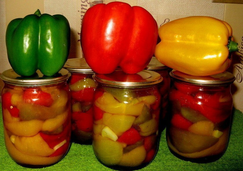 Один из самых простых — положить промытый, очищенный от семян и разрезанный на четвертинки сладкий перец в стеклянную банку, а затем залить горячим маринадом из воды, уксуса и специй в различных пропорциях (например, 0,5-1 стакан 10% уксус, 4 стакана воды, 0,5-1 столовая ложка соли, 3-6 столовых ложек сахара, 2-3 зерна душистого перца, 2-3 лавровых листа, 4-5 крупинок перца, дополнительно можно добавить 1 столовую ложку масла) . Банки, наполненные перцем и рассолом, тщательно закрывают и пастеризуют в течение 25 минут, а затем помещают в темное прохладное место.