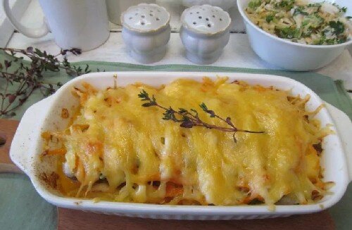 - На дно формы выложить половину овощной пожаренной массы, разровнять ее. Затем поместить куски или филе рыбы, тоже уложить их ровно. Поверх – снова слой оставшихся овощей.