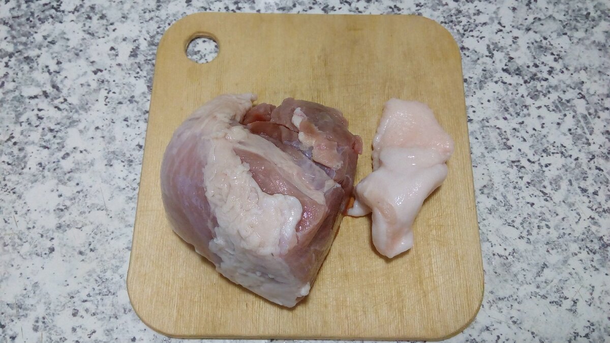 Итак, ставим на плиту закипать 2.5 литра воды. Берем свинину пожирнее (я к куску мяса добавила кусочек жира), моем, нарезаем на небольшие кусочки. Разогреваем сковороду и обжариваем свинину до корочки. Жарим без масла.
