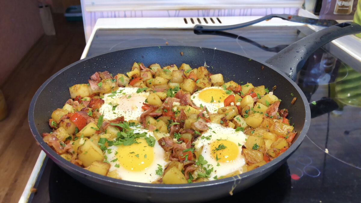 Шаг 6: Наступает финальный переворот картохи, поэтому пара добавить зелень, бекон и соль по вкусу. Перемешиваем и наша жареная картошка почти готова. Сейчас мы делаем 3-4 ямки, в которые добавляем маленькие яйца. Разбиваем в каждую ямку по яйцу, накрываем крышкой и готовим на среднем огнем или слабом огне примерно 5 минут, пока белки не застынут или свернуться, а желтки при этом останутся жидкими.
