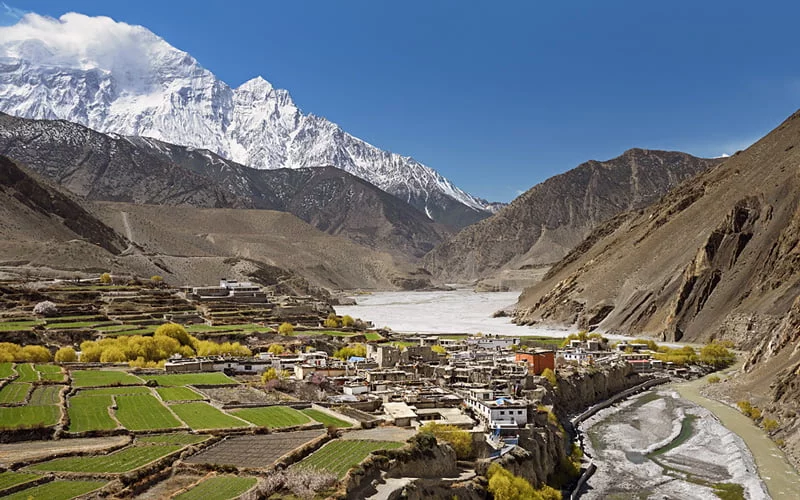 Большинство коренных жителей – это этническая группа тхакали, живущая за счет бизнеса и гостиничного хозяйства. Пройдя деревню Калопани, на север тянутся великолепные аллювиальные равнины. Отсюда начинается пыльный и засушливый пейзаж верхнего Мустанга. Деревья редеют, а с утра до ночи начинает дуть южный ветер, иногда достигающий скорости 45 узлов. Теперь это Тибетское плато.