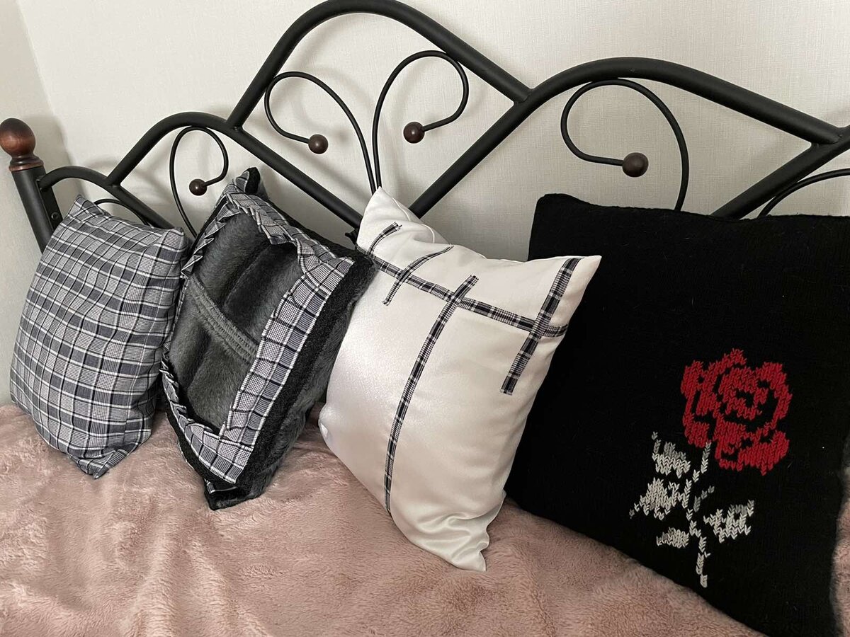 При изготовлении чехлов использовала черный свитер с вышивкой, серое платье в клеточку со складочками, белую атласную блузку и кусочки черно-серого искусственного меха. Старалась выполнить комплект так, чтобы все подушки были в единой цветовой гамме. Единственный нюанс заключается в том, что первоначальный вариант с мехом был задуман по-другому, но очень хотелось использовать складки от платья, поэтому получилось так. Сейчас я бы сделала по-другому.