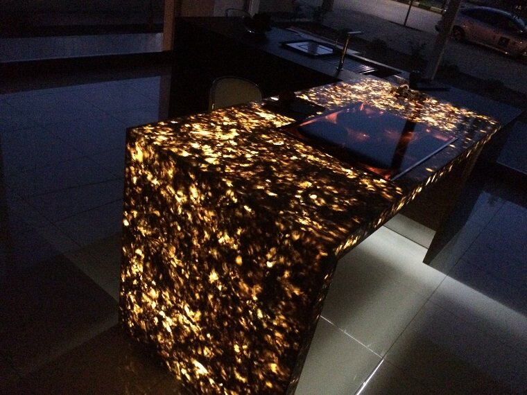 Подсвечивать можно самые разные изделия из камня: столешницы, мойки, лестницы, барные стойки, стойки ресепшн, колонны, декоративные панно на стенах или в полу, камины, душевые поддоны и так далее. И каждый элемент интерьера, помимо своей уникальности, может решать и другие задачи.