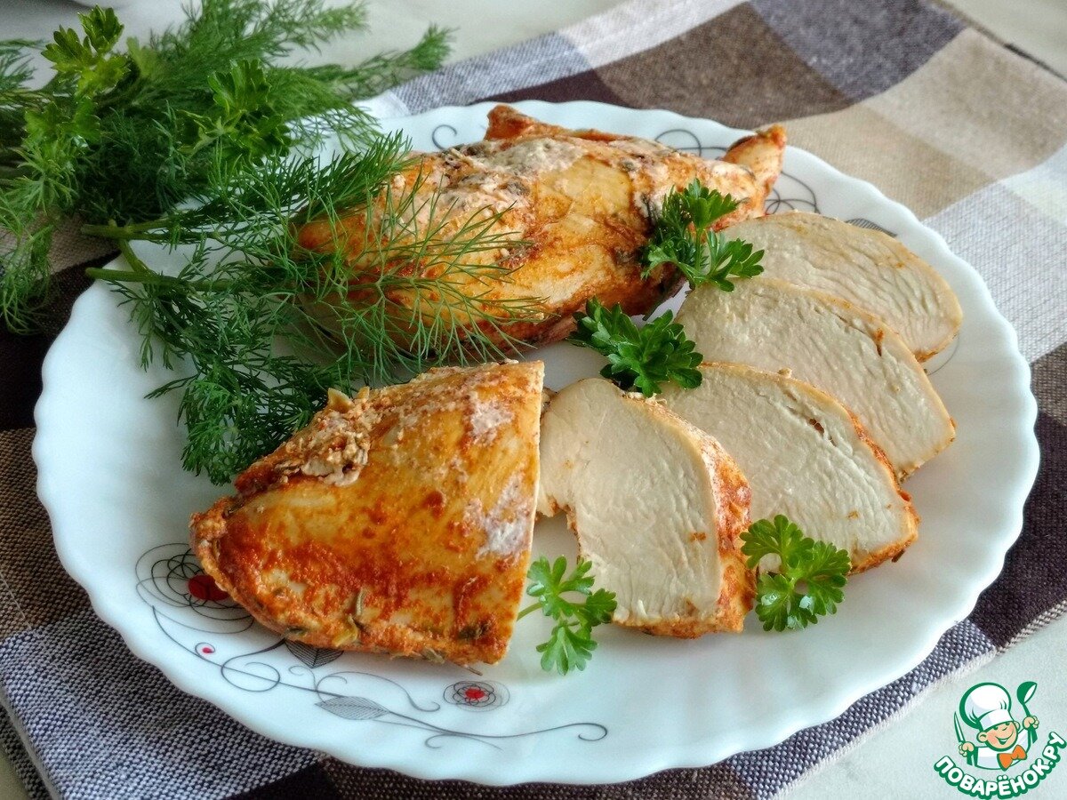 Филе куриной грудки хорошо смазать полученной смесью и оставить минут на 30, можно и дольше. Тем временем духовка разогревается до 250град С.