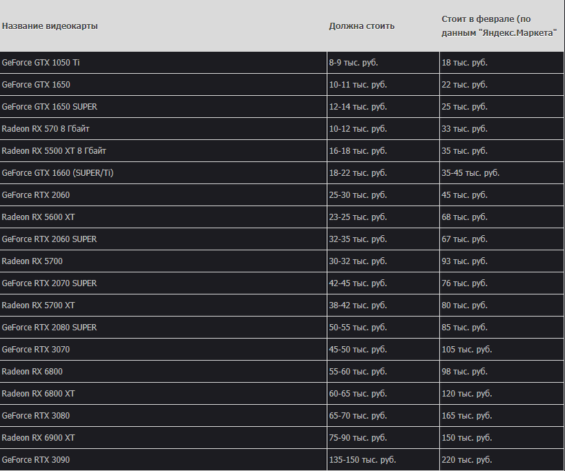 Ниже в таблице представлены цены на различные видеокарты, которые можно считать игровыми. Таблица, на мой взгляд, получилась довольно красноречивой и грустной.