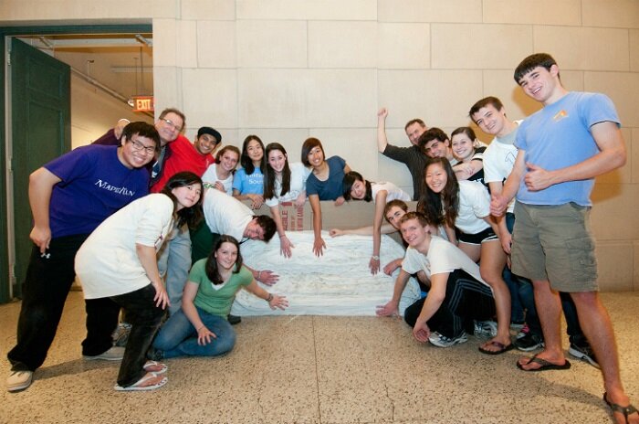 А вот если отойти от того условия, что складывать бумагу нужно делая каждый следующий изгиб перпендикулярно предыдущему, то мировой рекорд по складыванию бумаги насчитывает 12 складываний. Его поставила группа американских школьников (см. фото ниже). В ходе эксперимента использовался очень длинный рулон весьма тонкой и гибкой фольги. В этом случае, к слову, опасность порвать бумагу сильно уменьшается, однако проблема с быстро возрастающей толщиной стопки, а, следовательно, с наличием должного количества материала и технической возможности гнуть такие толстые объекты, сохраняется.