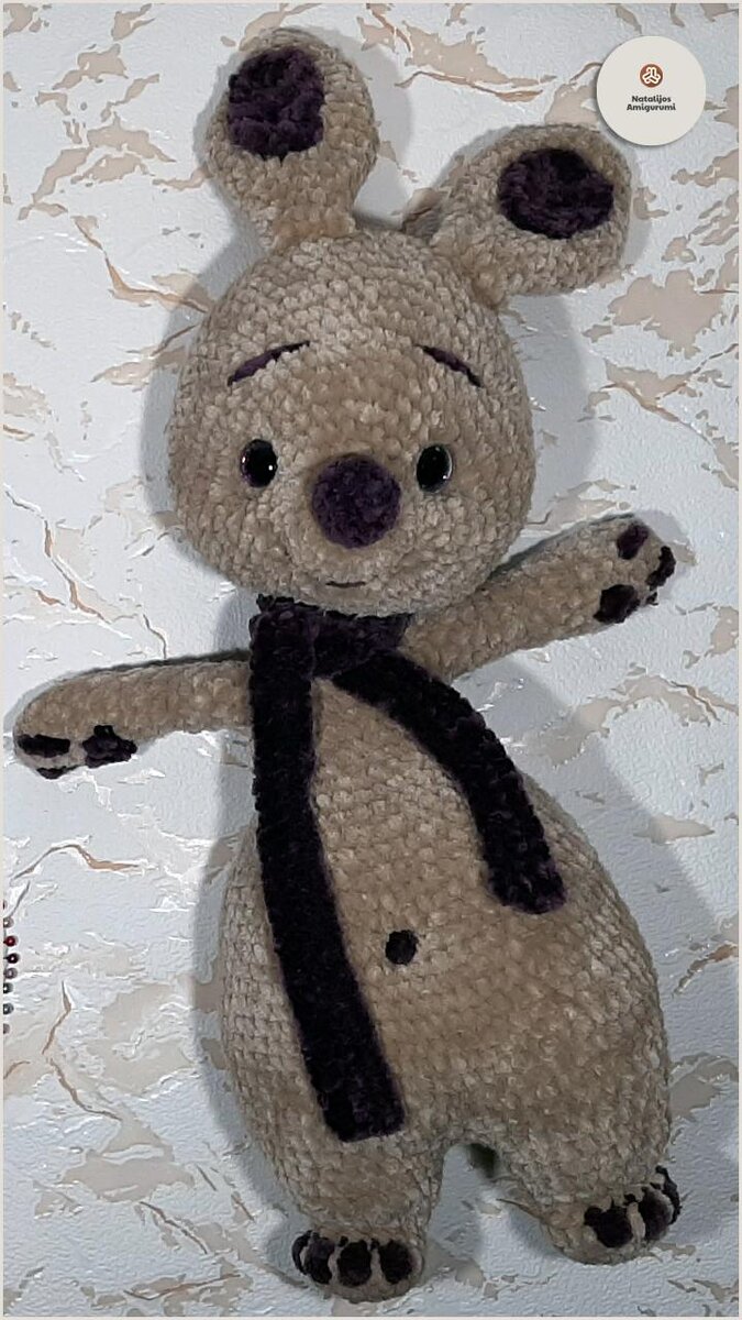Довязала ушки, сделала другим цветом вставки в ушки и подушки на передние лапки, связала шарфик, прикрепила связанный хвостик.