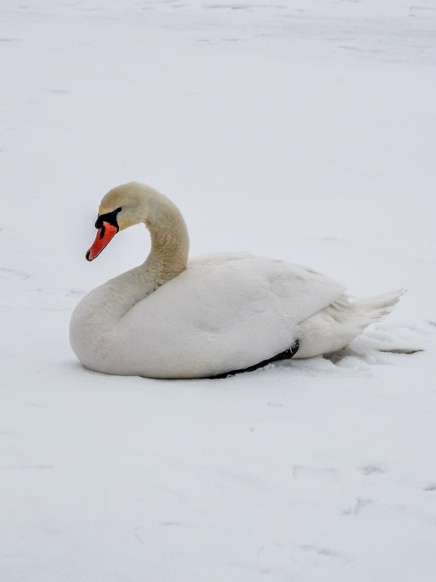 Лебедь недели 2 был местной достопримечательностью, его никто не кормил, не пытался потрогать - смотрели и фотографировали. Как только лебедь окреп, а морозы прошли, он перелетел на реку Нарова и кормился там самостоятельно.
