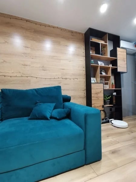 Диван хозяева подобрали бирюзового цвета, что выгодно смотрится на фоне светлого дерева. Недалеко от дивана поставили открытый шкаф необычной геометрической формы, сыграв на контрасте цветов.