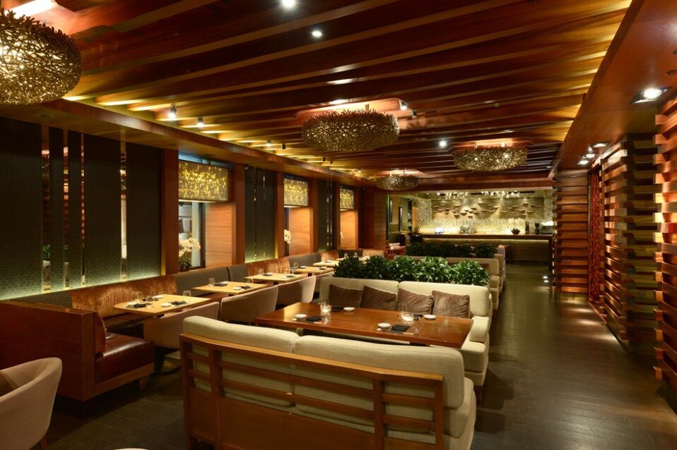 Японский ресторан от Аркадия Новикова на Патриарших прудах. Заведение с контактным суши-баром выполнено в духе японского минимализма, но в современном стиле: деревянные мебель и панели на стенах теплого оттенка, потолок с орнаментом, на одной из стен — красный круг, популярный национальный символ «облик реальности».