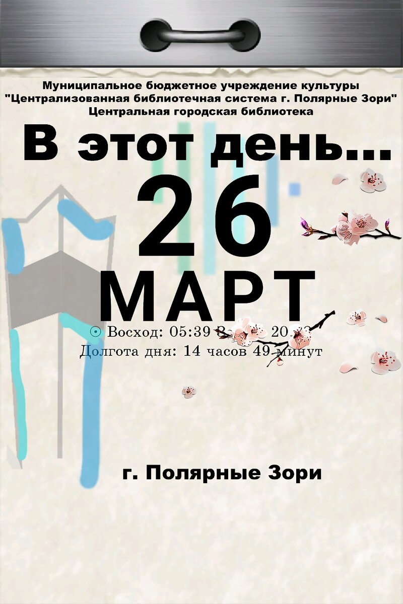 26 марта 1986 года – полярнозоринские спортсмены успешно выступят в стартовавшем в этот день областном турнире по борьбе дзюдо (г. Мончегорск), завоевав пять призовых мест.