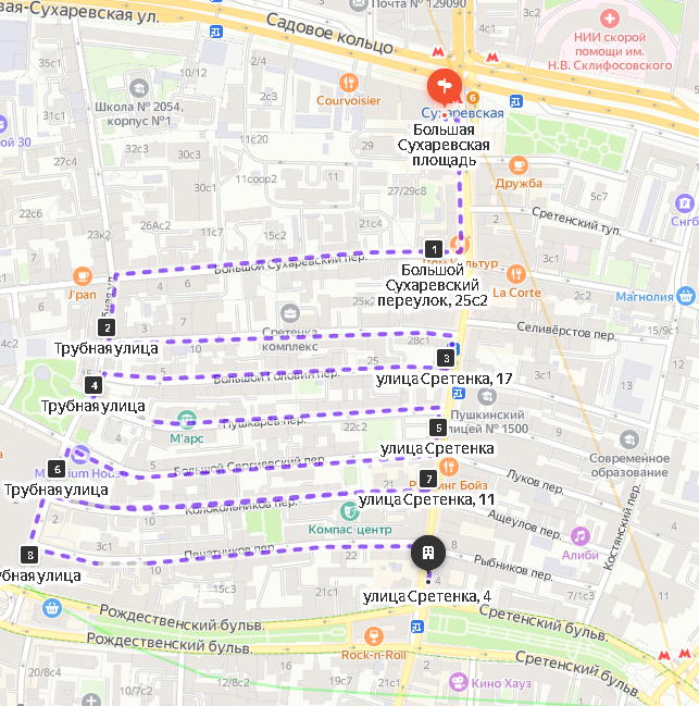 Общий маршрут- Чуть больше 4 км. Змейкой. От метро Сухаревская до Рождественского бульвара.