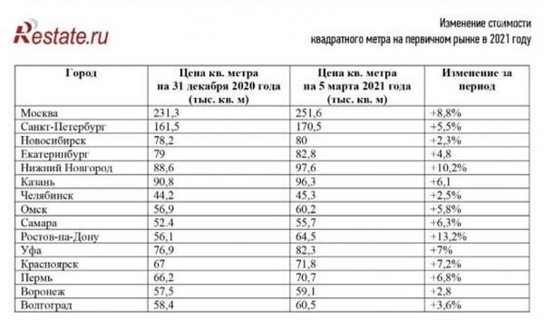 С начала 2021 года 1 кв метр здесь подорожал сразу на 13,2%. Второе место по росту стоимости квартир занял Нижний Новгород (на 10,2%). На третьем месте Москва (на 8,8%), на четвертом — Уфа (+7%), на пятом - Омск (+ 6,8%).