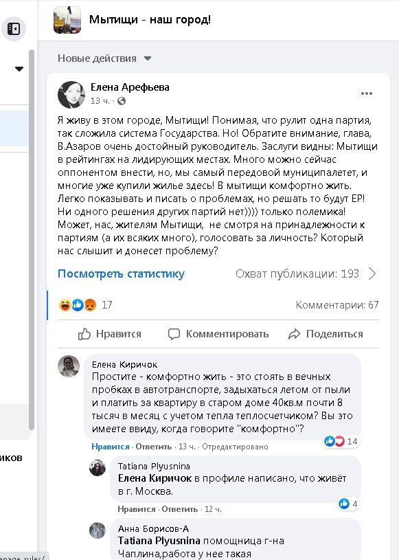 Сегодня в ФБ-сообществе «Мытищи — наш город» появился пост участницы группы Елены Арефьевой, помощницы Никиты Чаплина. То ли ее обидели ехидные комментарии в адрес шефа, то ли расстроила критика представителей ЕР в руководстве Мытищ, но она написала довольно эмоциональный пост. Приводим его дословно, с охранением пунктуации и стилистики автора: