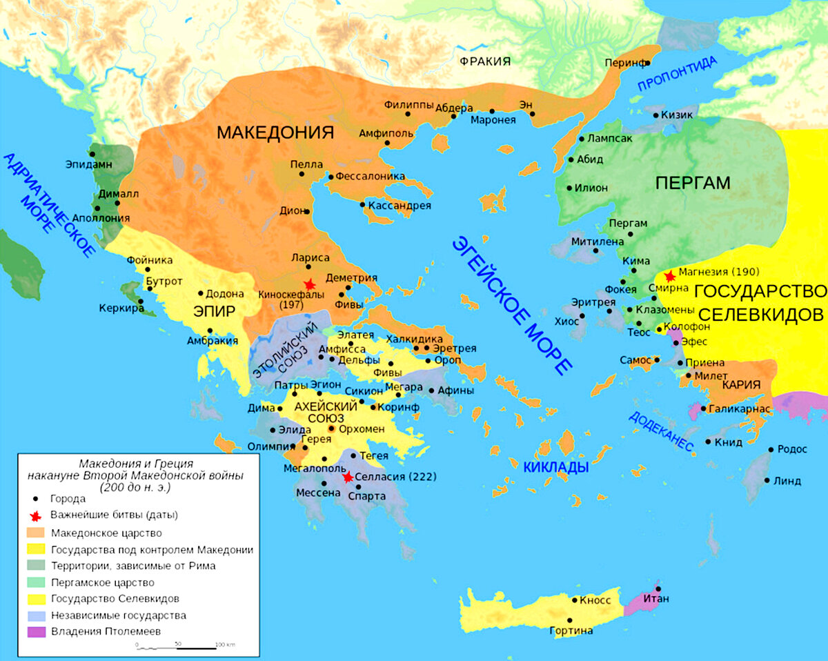 Ранее я упоминал о том, что Македония и Рим - каждый в так сказать своей половине Средиземноморья - Македония в восточной , Рим - в западной решали свои проблемы. Для Македонии это были соседние греческие государства объединенные в союзы - Этолийский, Ахейский; соседи на западе Иллирия и Эпир; северные - фракийские племена - тоже объединенные в пусть и рыхлые, но все же государства на основе племенных союзов. Кроме непосредственных соседей македонцам приходилось соперничать с царствами, основанными их же бывшими соотечественниками на территориях еще каки-то сто лет назад покоренных теми же македонцами - Пергамским царством, с центром в городе Пергам - где воцарилась династия Атталидов, основанная македонским кондотьером по имени Аттал, царством Птолемеев в Египте, управляемым династией Птолемеев - потомков Птолемея Лага, одного из ближайших друзей Александра. С сильнейшим, на тот момент в военном и политическом отношении греко-македонским (эллинистическим) государством Азии - Селевкидской державой, где правили потомки Селевка Никатора - тоже одного из друзей Александра, у македонских царей сложились более-менее нормальные отношения, обусловленные в основном наличием общих соперников - Пергама и Египта, и островного государства Родос.