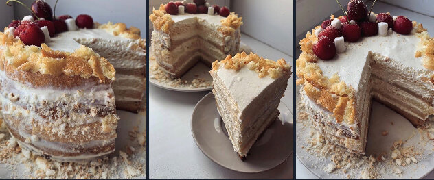 Украшения: с последнего коржа я срезала верхушку и покрошила ее, черешня, маршмеллоу, печенье (не учтено в КБЖУ)