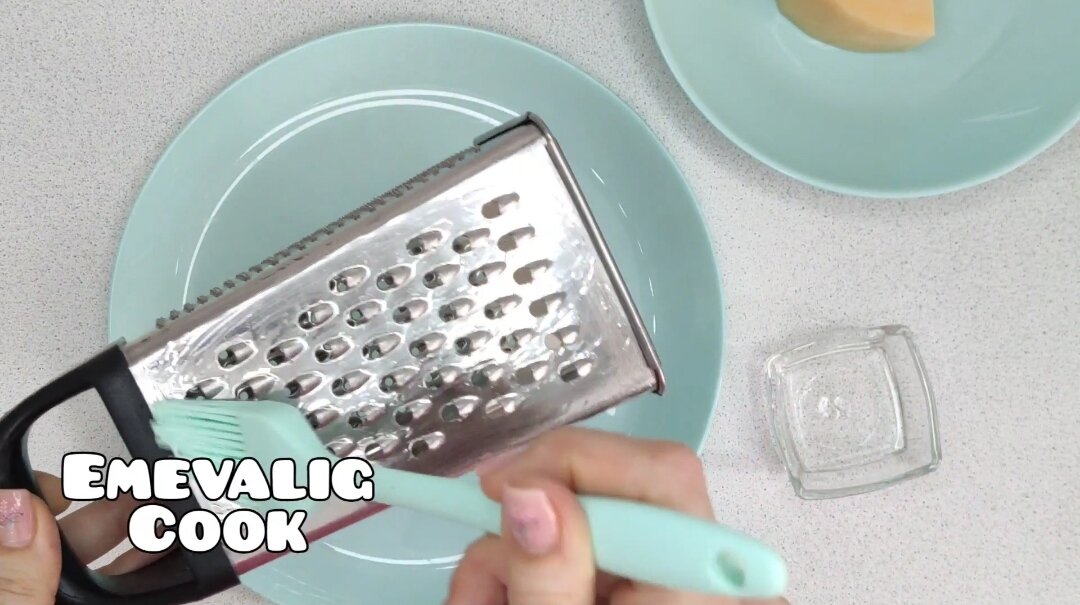 - Еще один лайфхак, которым я всегда пользуюсь. Терку, с той стороны, где буду натирать, смазываю подсолнечным маслом внутри и снаружи. Делаю это для того, чтобы сыр не прилипал к терке и не слипался после натирания, чтобы сыринка от сыринки отделялась. Особенно хорошо это заметно на мягких сырах, у меня сыр твердый.