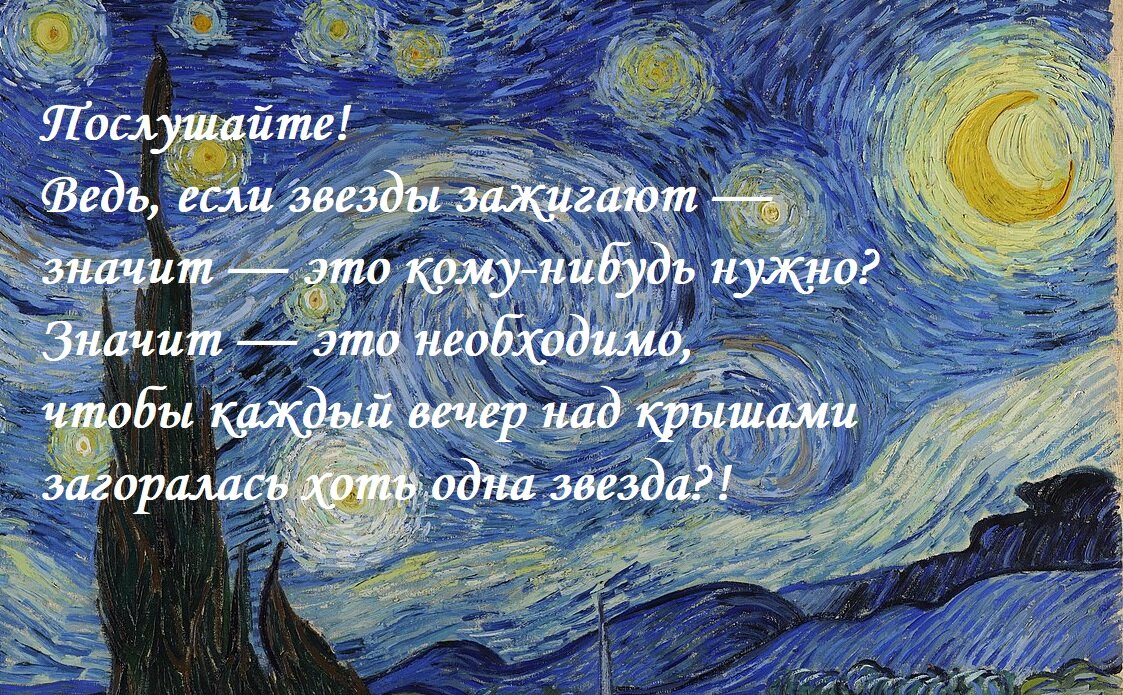 Маяковский писал: “Послушайте! Ведь, если звезды зажигают - значит - это кому-нибудь нужно? Значит - кто-то хочет, чтобы они были?” И дальше он продолжает в своем стихотворении говорить о человеке, который “врывается к Богу, боится, что опоздал, плачет, целует Ему жилистую руку, просит - чтоб обязательно была звезда! клянется - не перенесет эту беззвездную му́ку! А после ходит тревожный, но спокойный наружно. Говорит кому-то: «Ведь теперь тебе ничего? Не страшно? Да?!»”. Неплохое описание молитвенного ходатайства, правда? Духовные звезды - это расширяющиеся сердца детей Божьих, переставшие каменеть в эгоизме. Способные вмещать в себя все больше людей и их нужд. Господь говорит, что коснувшиеся других, обратившие их к правде, будут в вечности “сиять, как светила на тверди,...как звезды, вовеки, навсегда” (см. Дан 12:3).