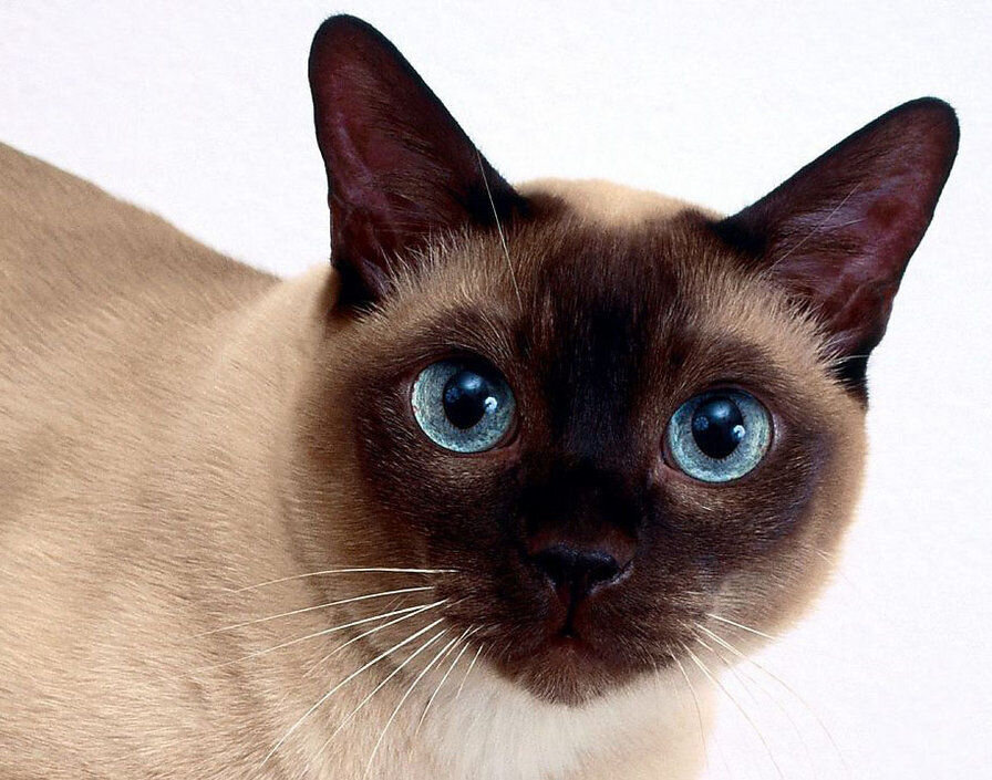- Сиамские кошки легко узнаваемы благодаря контрастному окрасу и выразительным бирюзовым глазам.