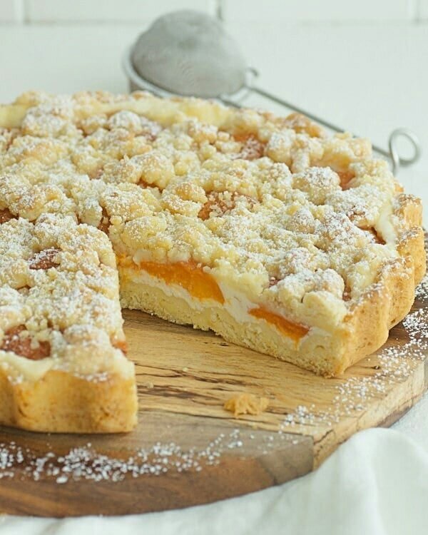 Разогрейте духовку до 175 ° C. Выложите все ингредиенты для штрейзеля в миску и перемешайте, чтобы получилась рассыпчатая масса. Равномерно распределите по пирогу. Выпекать пирог в разогретой духовке 40–45 минут до золотистого цвета. Достаньте из духовки, дайте остыть. Хранить в холодильнике до подачи на стол.