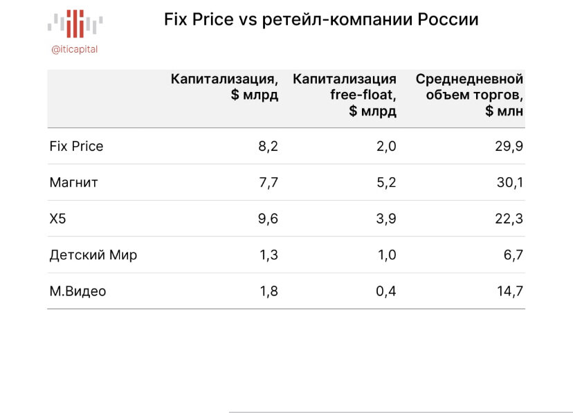 Fix Price ($8,2 млрд, free-float 24%) сравнима с капитализаций Магнита ($7,6 млрд, 68%), Х5 ($9,6 млрд, 41%) и значительно превосходит капитализацию М.Видео ($1,8 млрд, 20%), Детского Мира ($1,4 млрд, 75%).