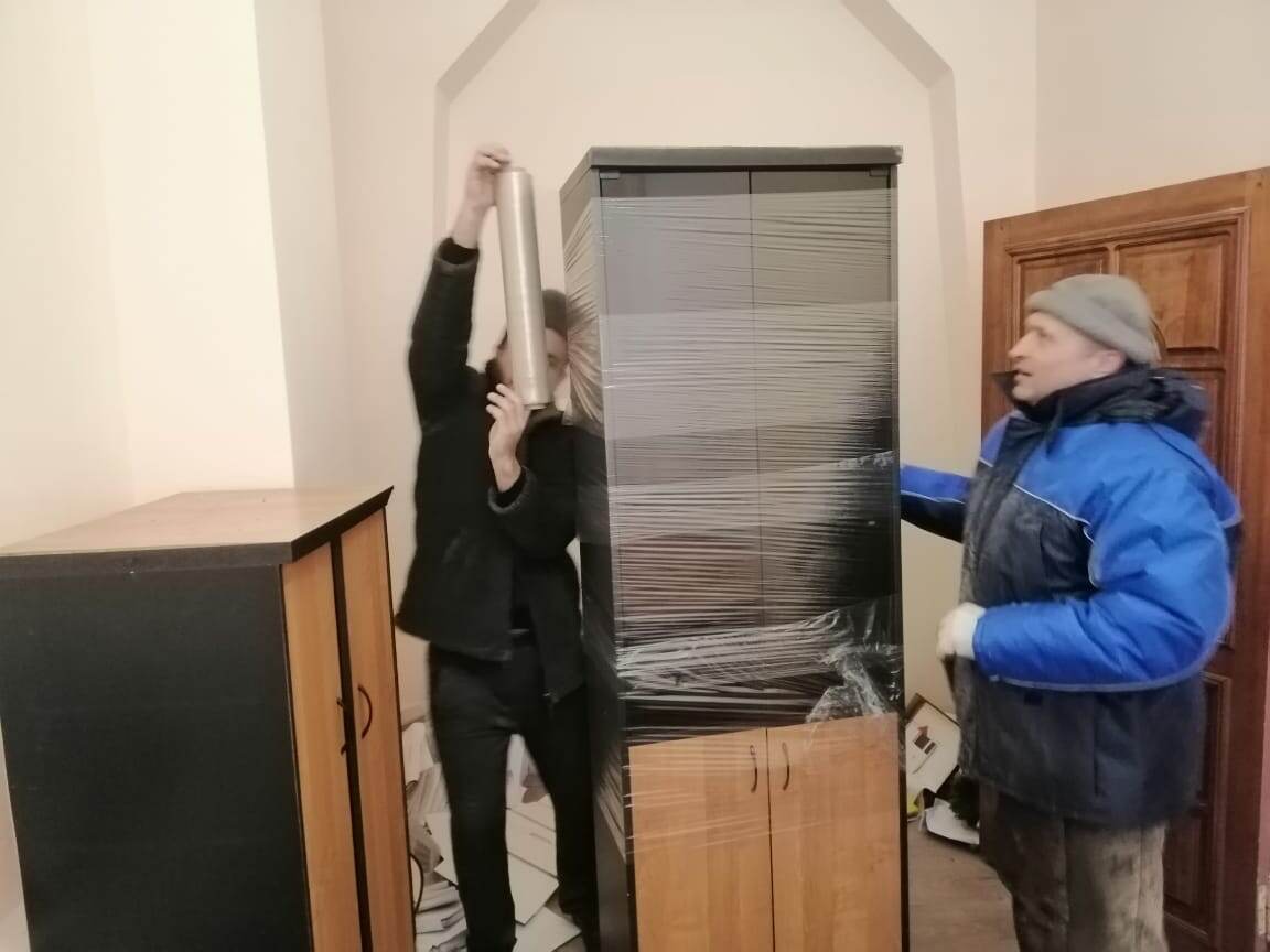 Вот фотография, на которой два грузчика упаковывают стрейч-плёнкой офисный двустворчатый шкаф: