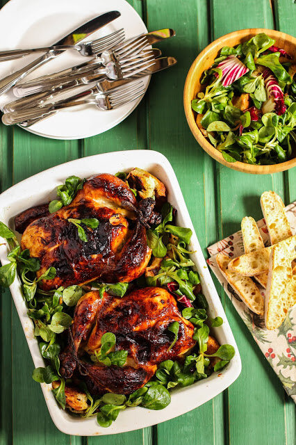 Запекать сначала при 200 градусах до появления румяной коричневой корочки 25 минут, затем снизить температуру до 180 градусов и запекать еще 50-55 минут до полной готовности. Если у вас есть кулинарный термометр, то его надо вставить в самую толстую часть бедра (но не упирать в кость). Курица готова, когда он показывает 74 градуса. Переложить цыплят на блюдо, накрыть фольгой и дать отдохнуть, пока готовится салат.