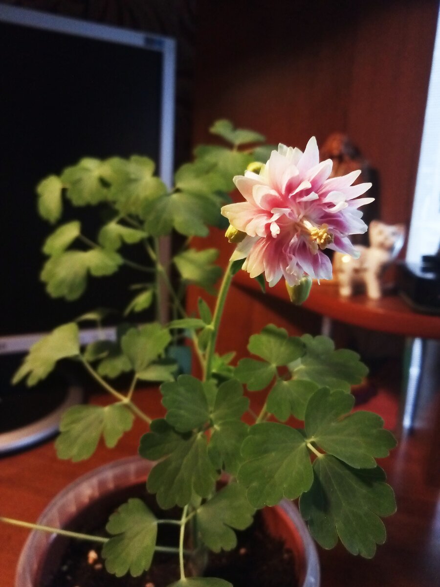 В прошлом месяце я рассказывала, как под воздействием цветочного гипноза приобрела аквилегию. Так как корешок был дохленький, посадила в горшок. И вот на днях она взяла да и зацвела.