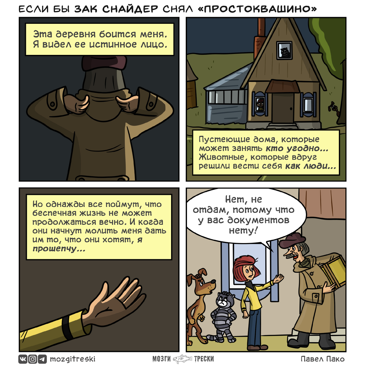 С вашего позволения, начну я эту подборку с комикса, который нарисовал для своего творческого проекта под названием Мозги трески. В целом, в рамках моей серии юмористических веб-стрипов и так частенько выходят зарисовки на тему различных популярных фильмов и анимации, а тут еще и появился отличный повод вновь нарисовать что-то в таком же духе. Поэтому в итоге мне, конечно же, было сложно отказаться от участия в таком «флешмобе». Тем более, что «Лигу справедливости Зака Снайдера» сам я очень ждал и, само собой, посмотрел фильм когда он наконец-то вышел. Свой комикс на тему «Что, если бы Зак Снайдер снял...» я посветил известному мультфильму «Каникулы в Простоквашино», при этом не забыв оставить довольно очевидную отсылку к одному из фильмов, который снял режиссер новой «Лиги справедливости».