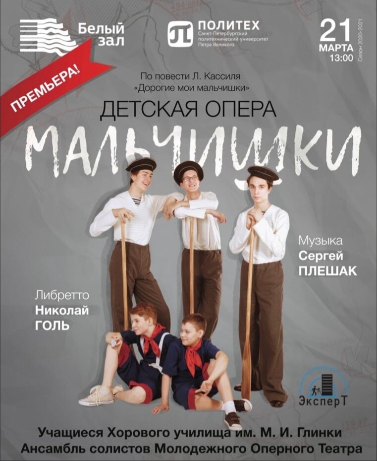 Оперу Сергея Плешака «Мальчишки», посвященную 75-летнему юбилею победы в Великой Отечественной войне, представят учащиеся Хорового училища им. М. И. Глинки в сопровождении ансамбля солистов Молодежного Оперного Театра .