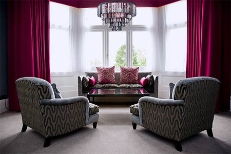 2. Создайте гармонию. Шторы и обивка мебели подбираются под отделку. Можно использовать различные оттенки одного цвета или соседние цвета на круге.