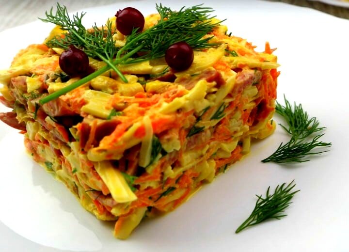 В глубокий салатник нарежем ветчина на соломку. Твердый сыр натрем на крупной терке. Морковь очистим, натрем на терке по-корейски прямо в салатник.