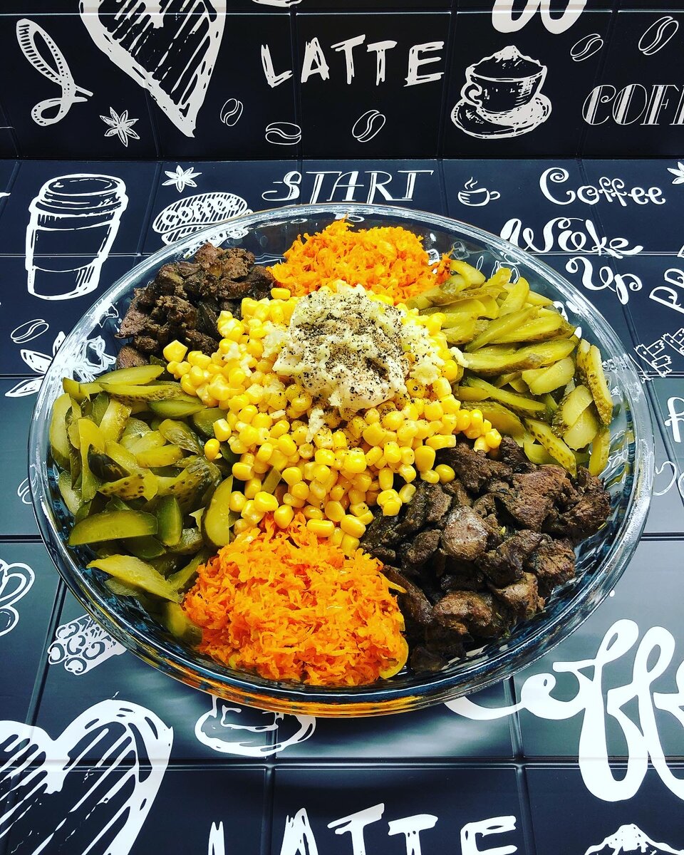 Выкладываем обжаренную печень, маринованные огурцы, кукурузу на блюдо.