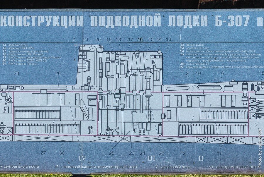 В прошлых репортажах (ссылки будут в конце) мы познакомились с историей транспортировки подводной лодки Б-307 с Балтики в Технический музей им. Сахарова в Тольятти, изучили ТТХ проекта, внимательно осмотрели субмарину снаружи, забрались в первый торпедный отсек и остановились в носовой части жилого отсека II. Продолжим нашу увлекательную экскурсию. Но для начала еще раз обратимся к схеме внутреннего устройства подводной лодки проекта 641Б "Сом" ("Tango" по классификации НАТО), а точнее только к схеме II, III и IV отсеков, которые мы сегодня посетим вместе с вами.