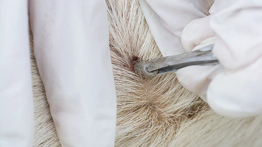 - Шерсть в том месте, где сидит клещ, нужно раздвинуть пальцами одной руки . Во вторую же руку нужно взять пинцет;