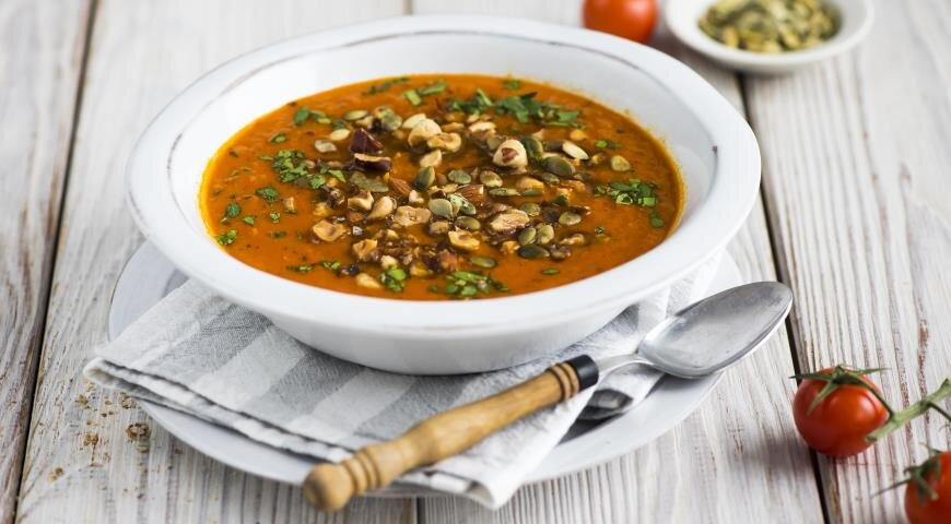 Готовый суп измельчите блендером в гладкое пюре. Приправьте солью и черным перцем. Разлейте суп по тарелкам, украсьте орехами и тыквенными семечками и посыпьте мелко нарезанной петрушкой.