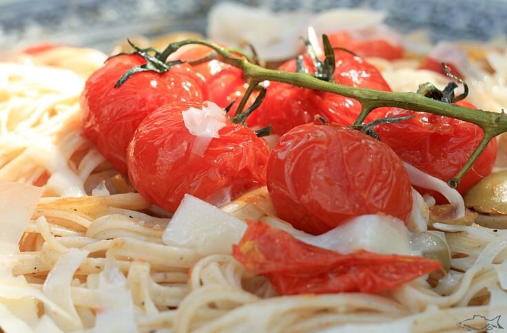 Через 30 минут достаем форму с сыром, черри и беконом. Все аккуратно перемешиваем.