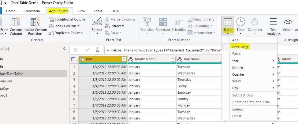 Создание столбцов DateKey и TimeKey может быть выполнено с помощью встроенных функций в редакторе Power Query. Всегда помните: если вам нужно время вместе с датами, обязательно разделите столбец datetime пополам - отдельно дата и отдельно время. Вы можете использовать тот же процесс для преобразования времени в десятичное число и использовать временную таблицу для ваших будущих функций времени. Ниже приведены несколько снимков экрана, которые помогут вам в этом процессе.