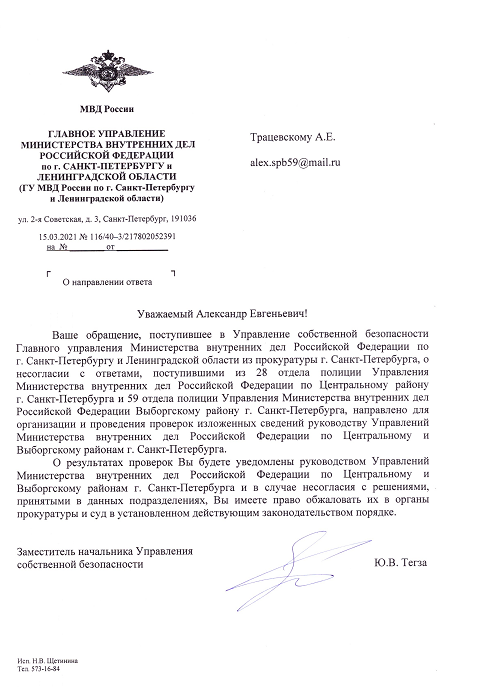 Добрый день! Поскольку 10.03.2021г. мной получены ТРИ ОТПИСКИ ИЗ УСБ ГУ МВД по СПб и