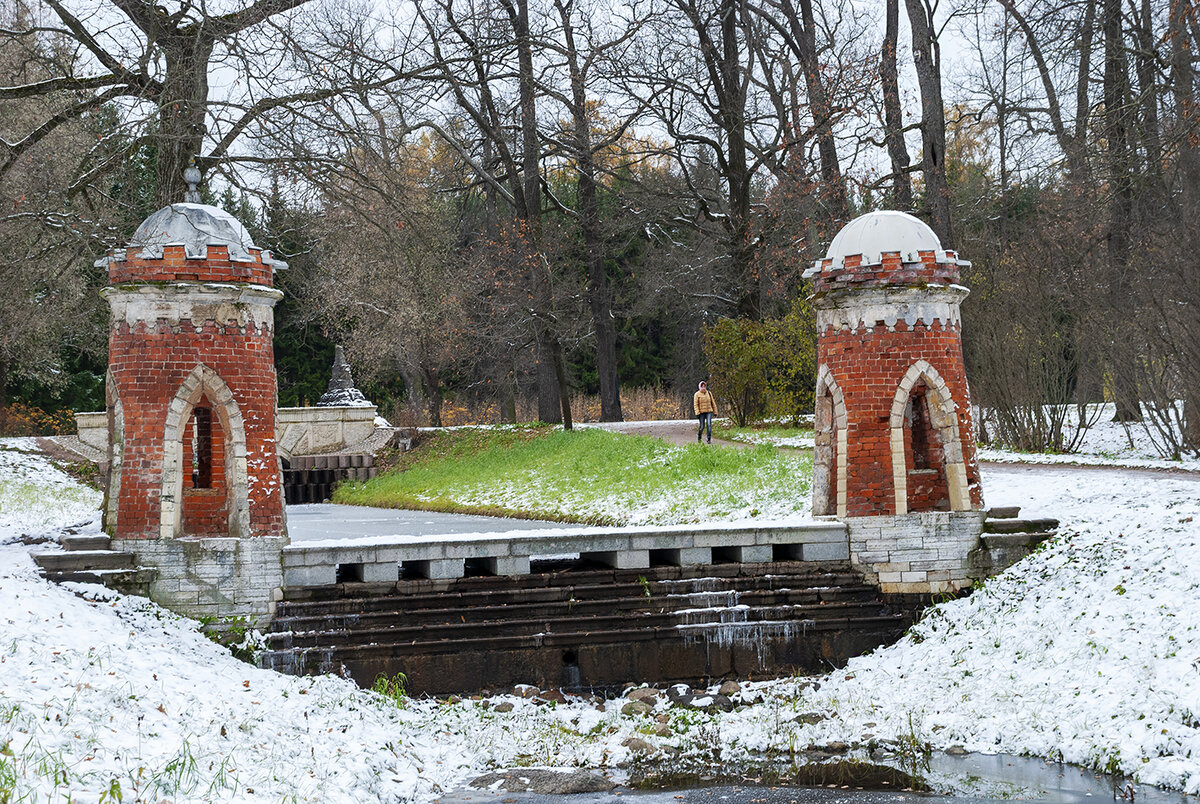 О Башне-руине мы уже говорили в статье о руинах-постройках в Царскосельских парках. Башня является своеобразным памятником победам в Русско-Турецкой войне 1768-1774 годов, о чем есть надпись на замковом камне арки над входом в башню.