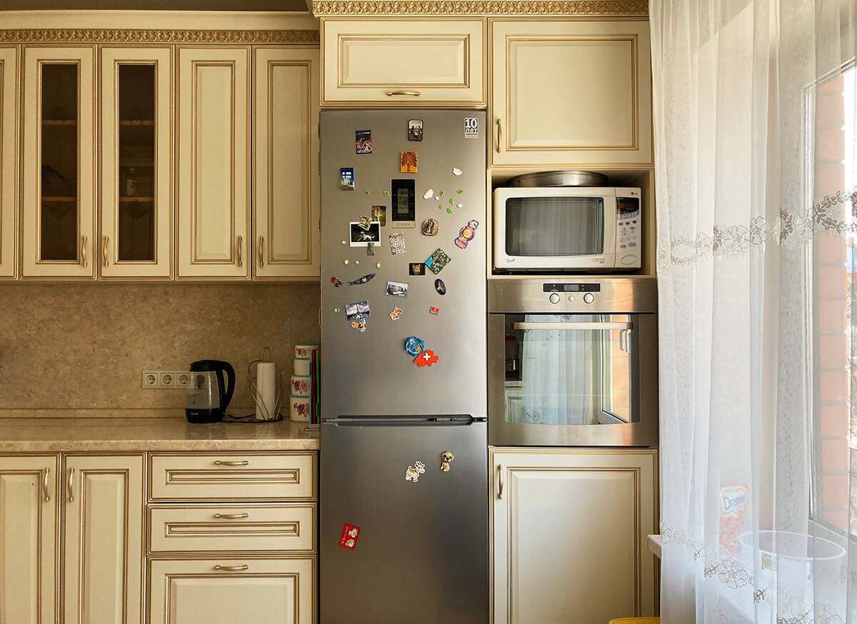 При высоте 1,6 метра и 2 метра разные модели холодильников занимают примерно одну площадь на кухне, поэтому я выбрала вариант побольше. Да, чуть дороже, но места что в шкафах, что в холодильнике много не бывает.