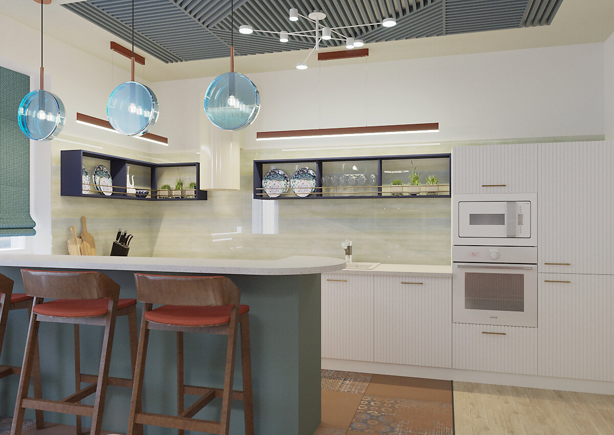 Торцы вообще очень важный момент, который стоит учесть заранее. Особенно, если речь идет о 3D панелях. На фото ниже лепнина на фасадах смотрится круто за счет того, что кухонные шкафы немного углублены в нишу, и боковые части панелей не выступают наружу.