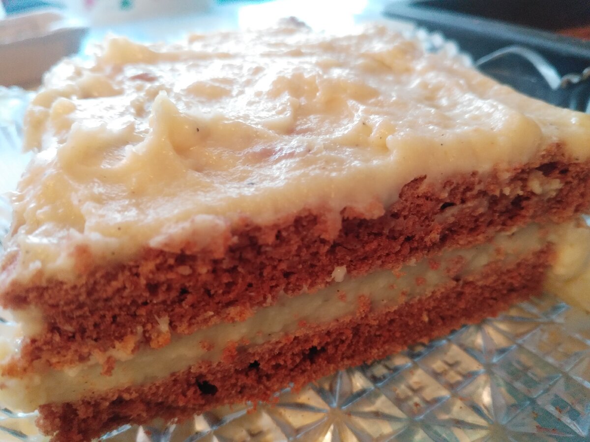 Достаём коржи из духовки, разрезаем и пропитываем небольшим количеством молока. Собираем наш торт и отправляем в холодильник на час.