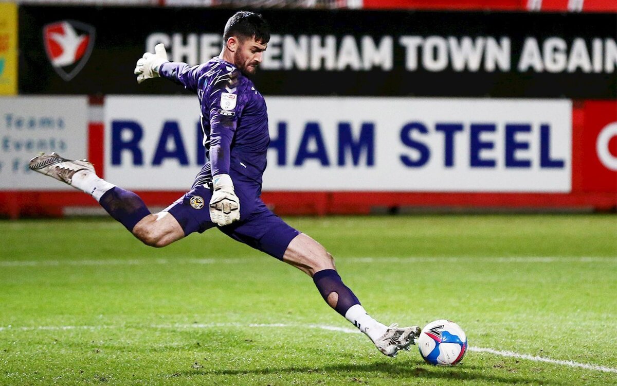 Вратарь клуба «Ньюпорт Каунти» Том Кинг выбивал мяч от ворот.