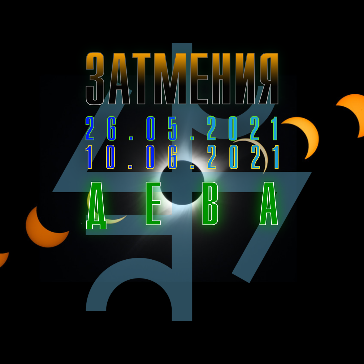 Обозначим персональный прогноз для типичных Дев на период с середины апреля до середины июля 2021. Получится композитный прогноз сразу по обеим картам, которые работают вместе, одно затмение связано с другим.